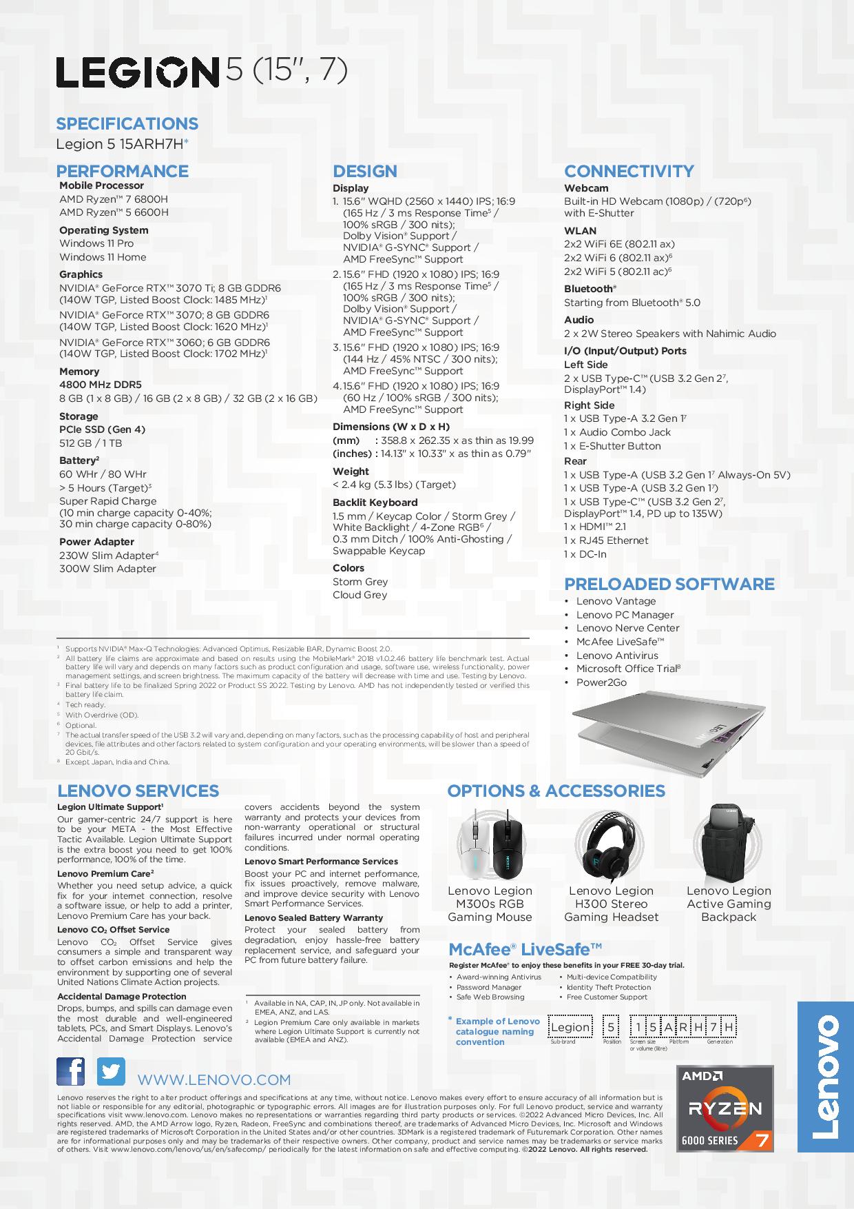 [RTX 3060] Lenovo Legion 5 15ARH7H | 82RD0002SB | 15.6" WQHD (2560x1440) | AMD Ryzen 7 6800H | RTX 3060 | 16GB RAM | 1TB SSD | Win11 home | 3Y Legion Ultimate Support