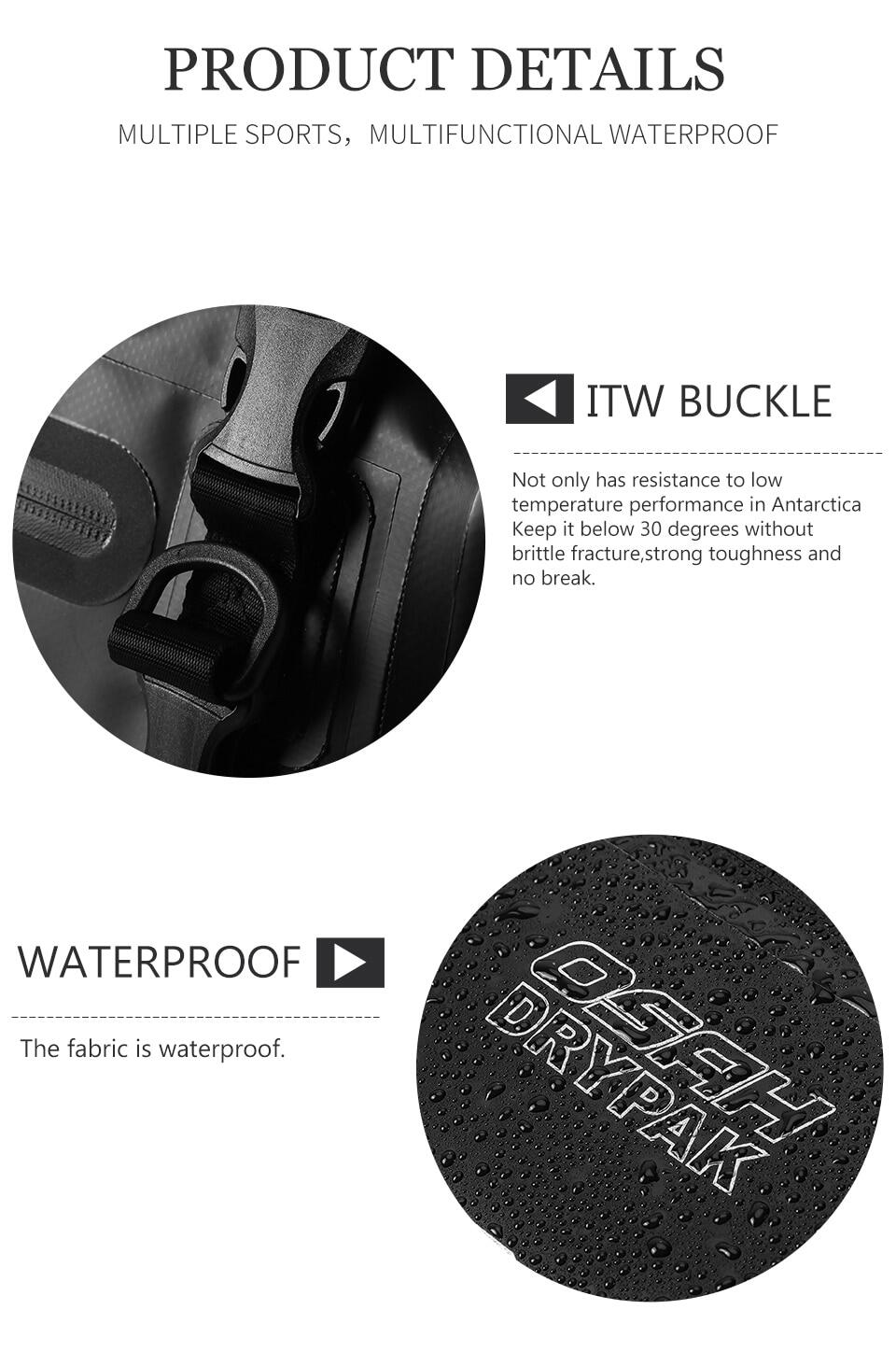 ②Waterproof Material: This waterproof bag adopted international top brs' ultra-high strength materials, combined hyperthermia hot pressing technique, with roll top design, waterproof effect far beyond the traditional waterproof zippers Velcro. It's also snow proof, hail proof, resistance to high temperature low temperature, you can travel with it in any weather. Don't need worry about your luggage.