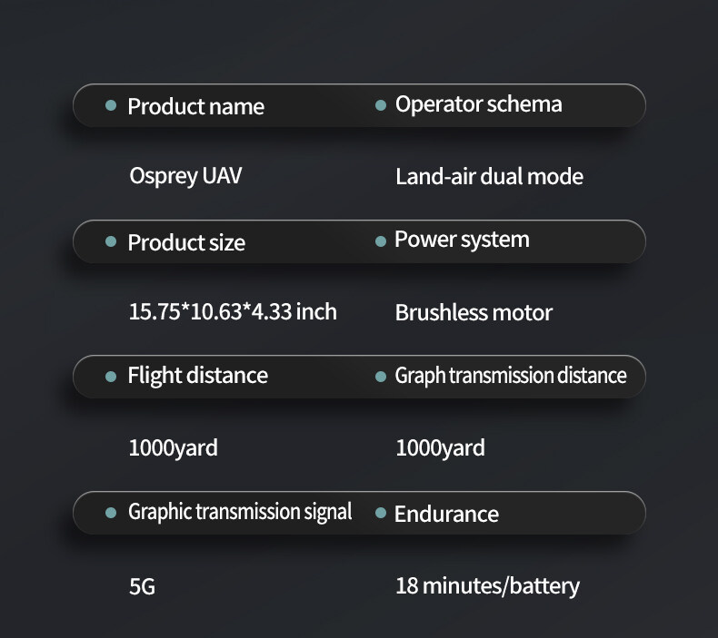 Image transmission distance: 5G image transmission distance is 200-800 meters (depending on the flight environment)